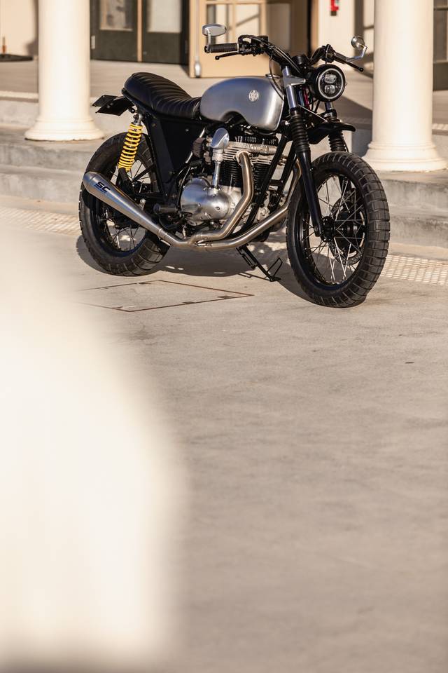 Keeping with the less is more theme the frame, wheels and fiddly bits were powder coated in a satin black finish. While the engine and tank were left raw and brushed. Custom sand cast badges complete the look.