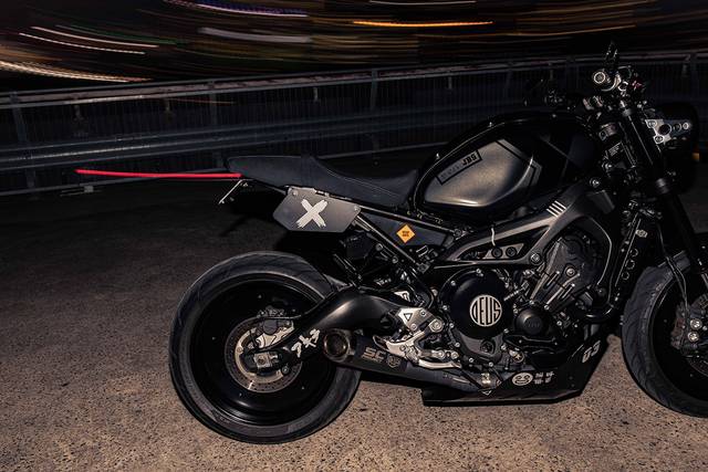 Espelhos MO.View Blade também da Motogadget foram colocados nas pontas de um guidão cônico da @rizoma, dando à moto um visual sinistro.